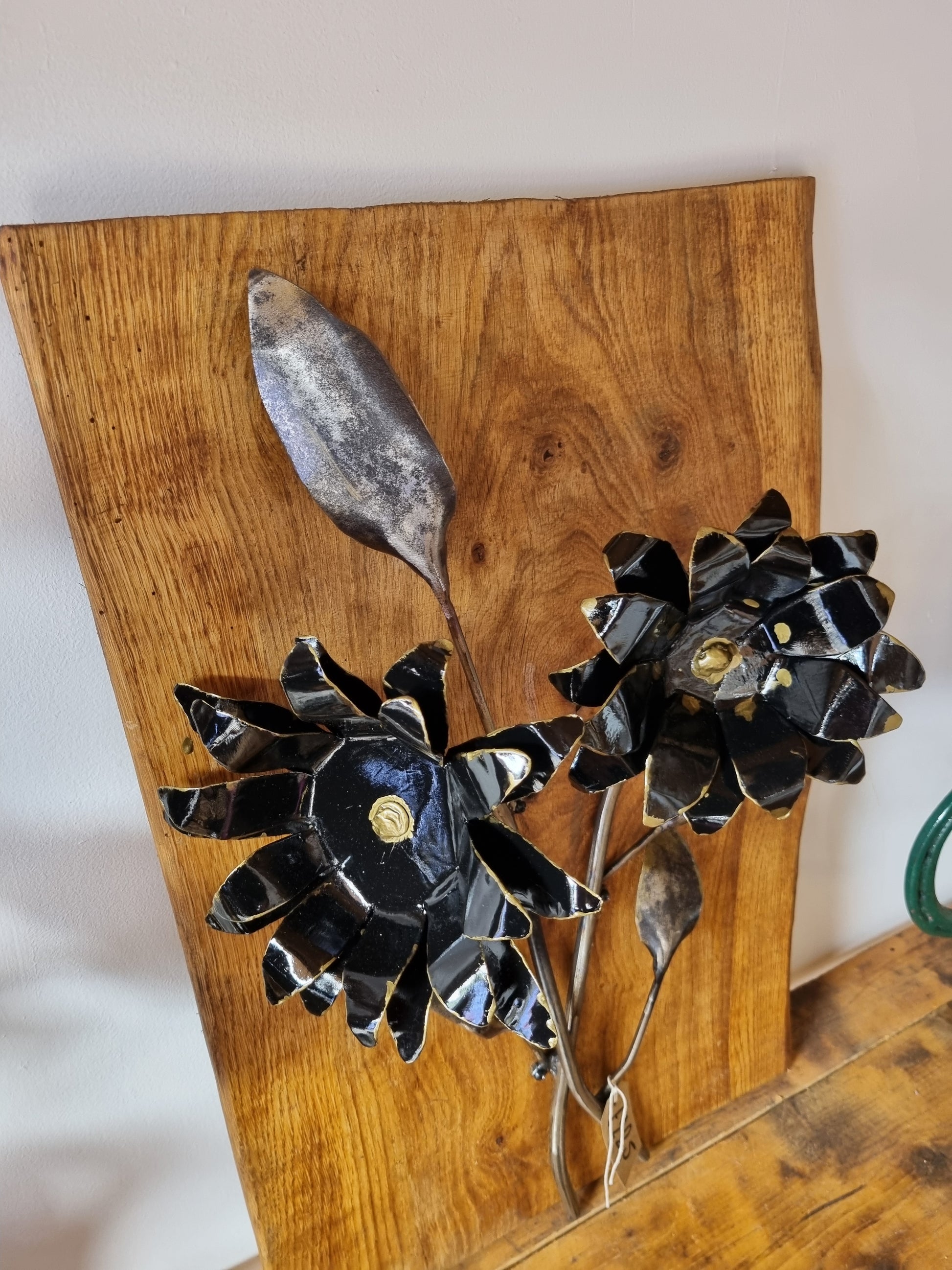 Bring natural beauty and craftsmanship together with Flowers on Wood, a striking sculpture handcrafted from decommissioned fire extinguishers and reclaimed timber. Each petal and leaf is individually shaped and welded, creating a unique floral design that contrasts the warmth of wood with the cool, industrial character of metal.