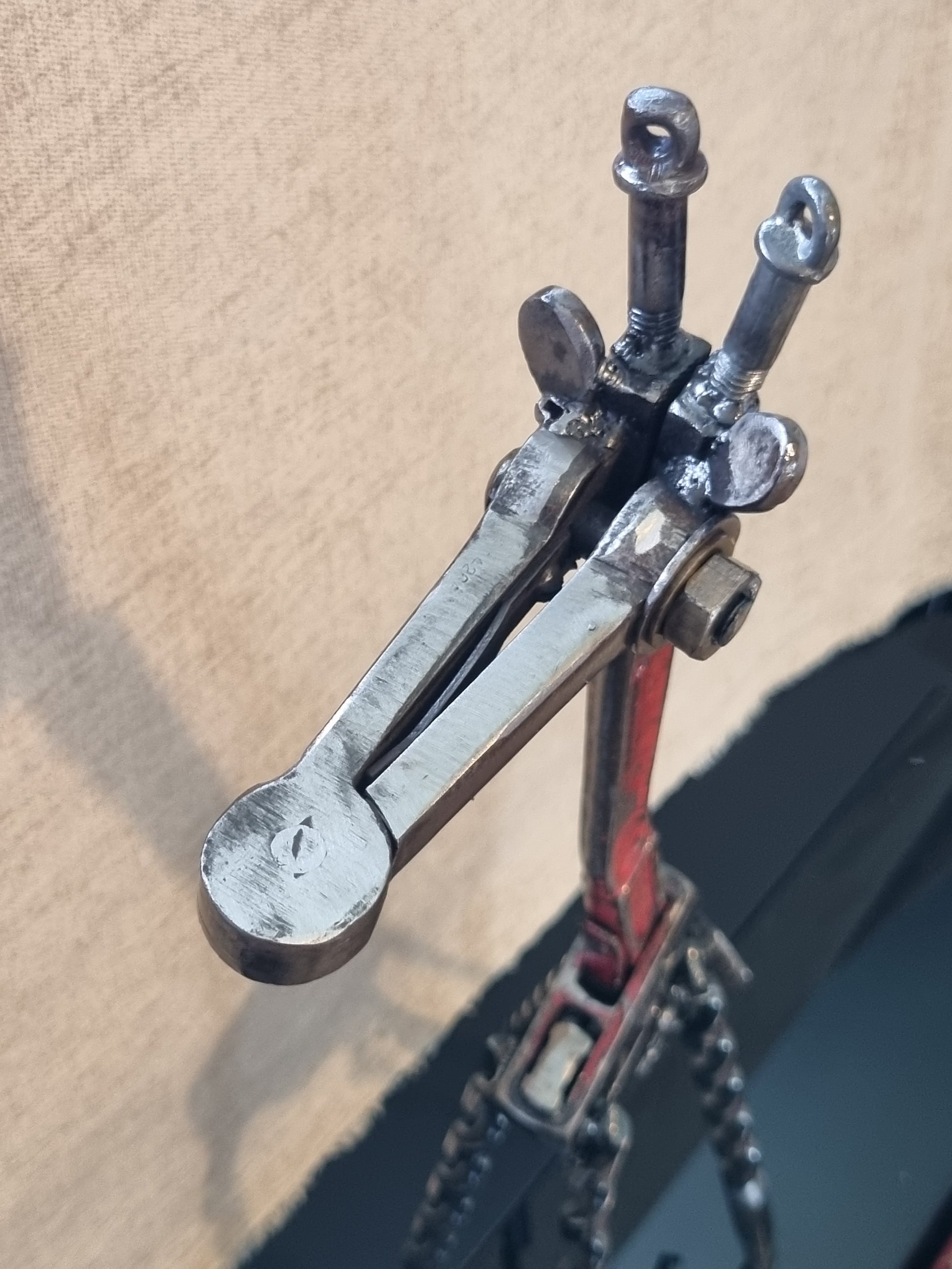 Meet Twizzle the Giraffe, a tall and quirky creation standing 70cm high and 18cm wide. Twizzle is handcrafted entirely from reclaimed metal, featuring a playful design that celebrates both creativity and sustainability. With his long neck, slender legs, and charming posture, Twizzle is a true conversation starter — full of character and industrial charm.