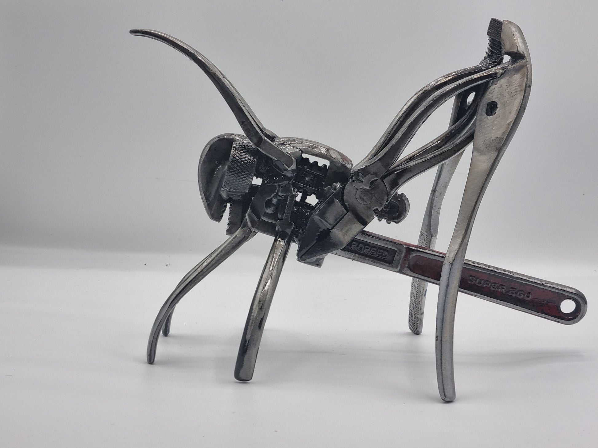 This grasshopper sculpture captures the bold, dynamic form of a grasshopper while showcasing the creativity of sustainable design. Handcrafted entirely from reclaimed metal tools and hardware, it brings a unique industrial twist to a natural subject.